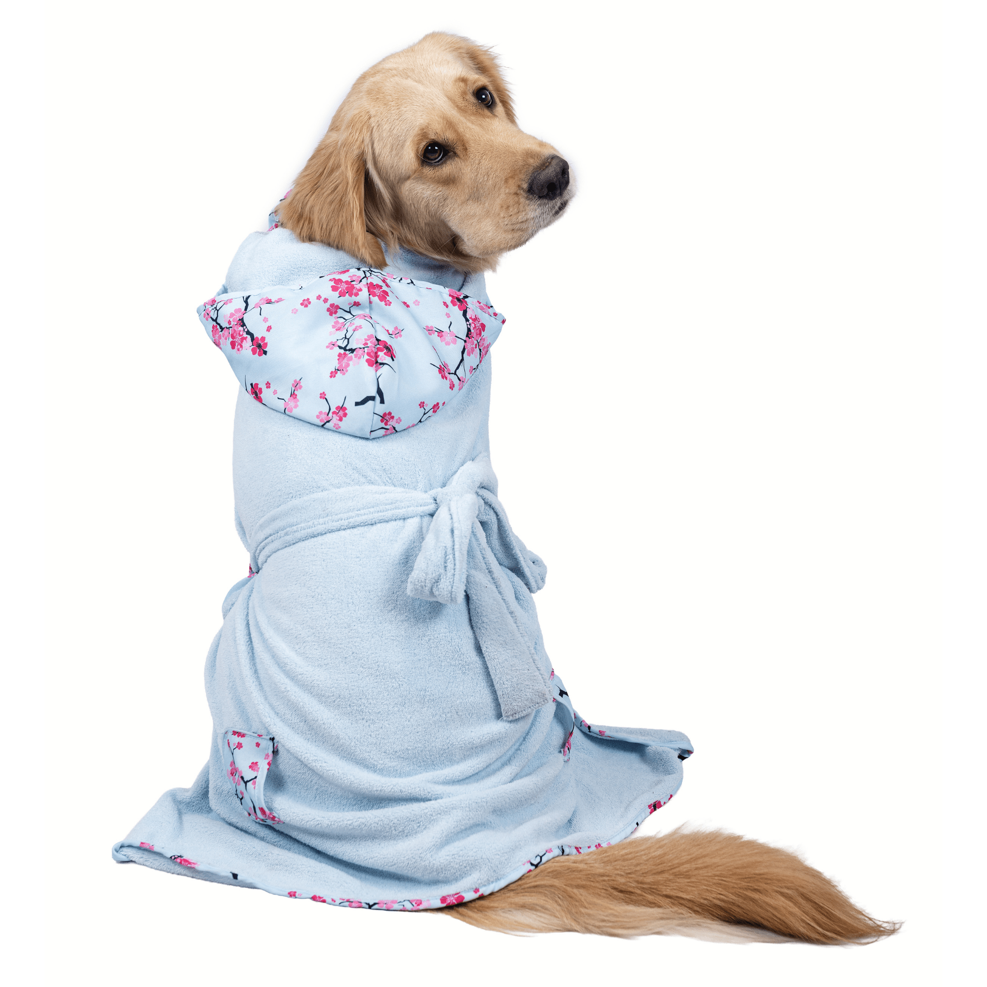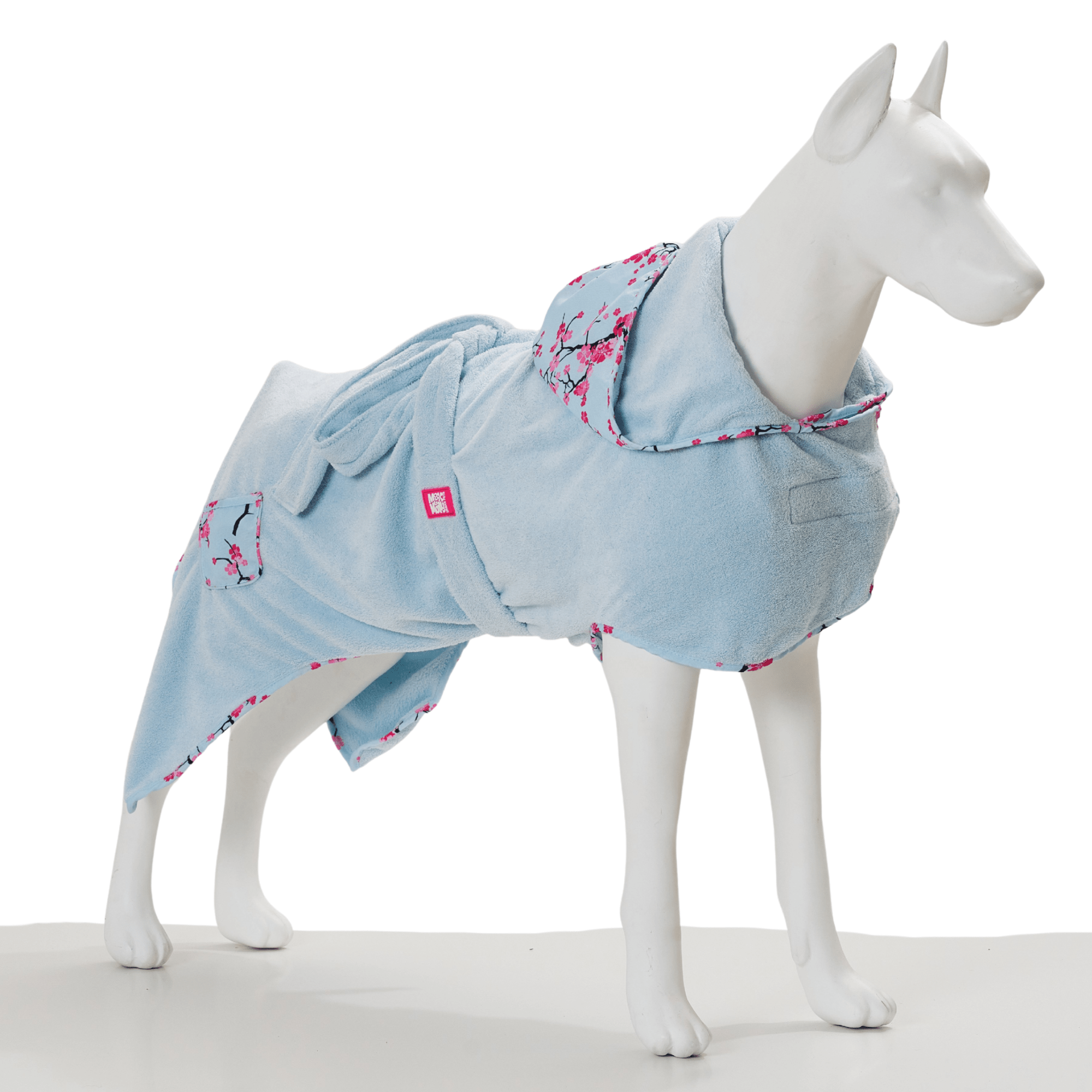 It is ideal for quickl dressing after bathing, after rainy walks or launging around. The bathrobe does not have to be pulled over your dog's head. An adjustable velcro fastener at the breast and a belt create an individual fit for almost every four-legged friend. A cozy hood completes the sweet look - you'll simply fall in love with it!